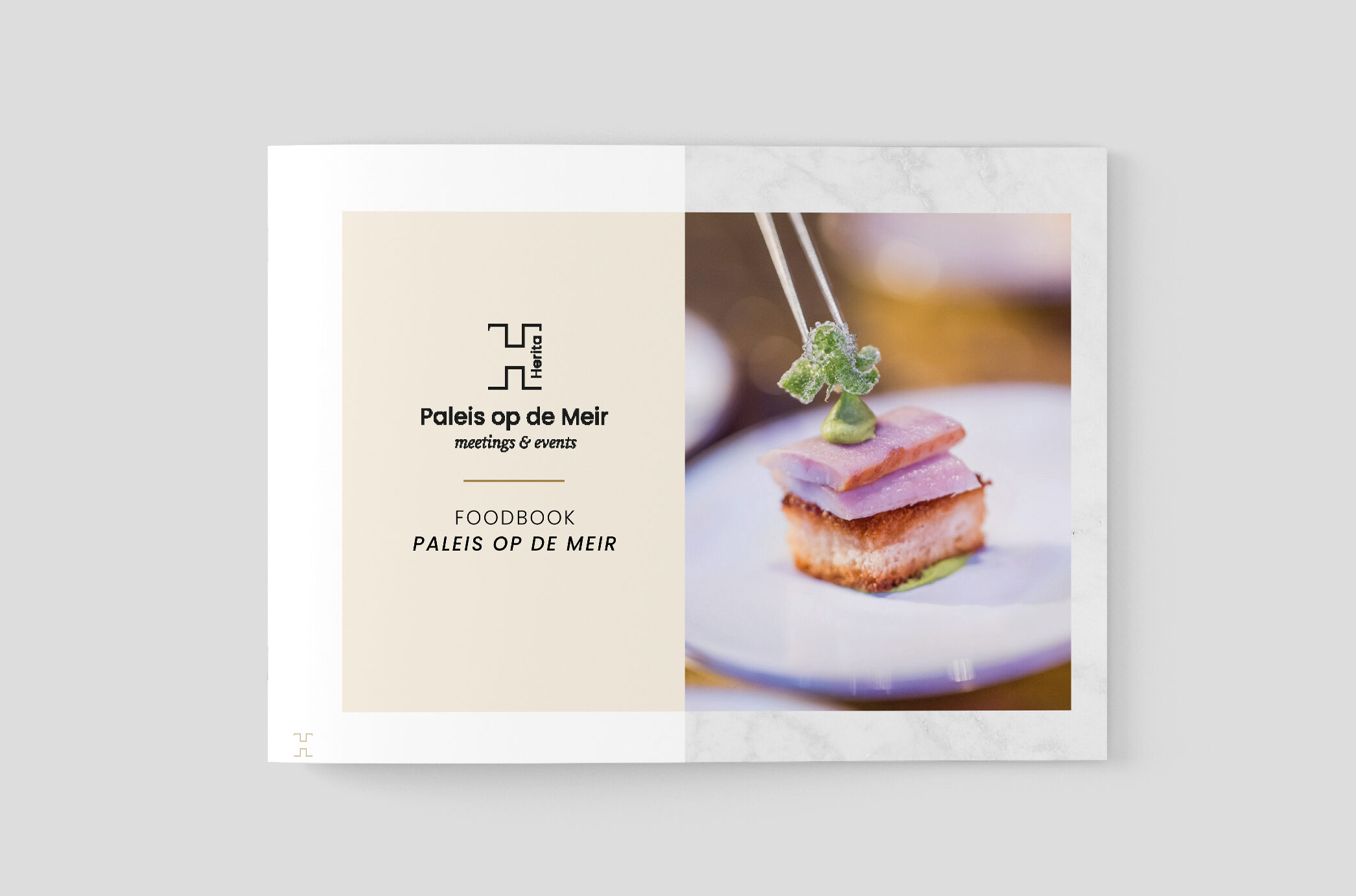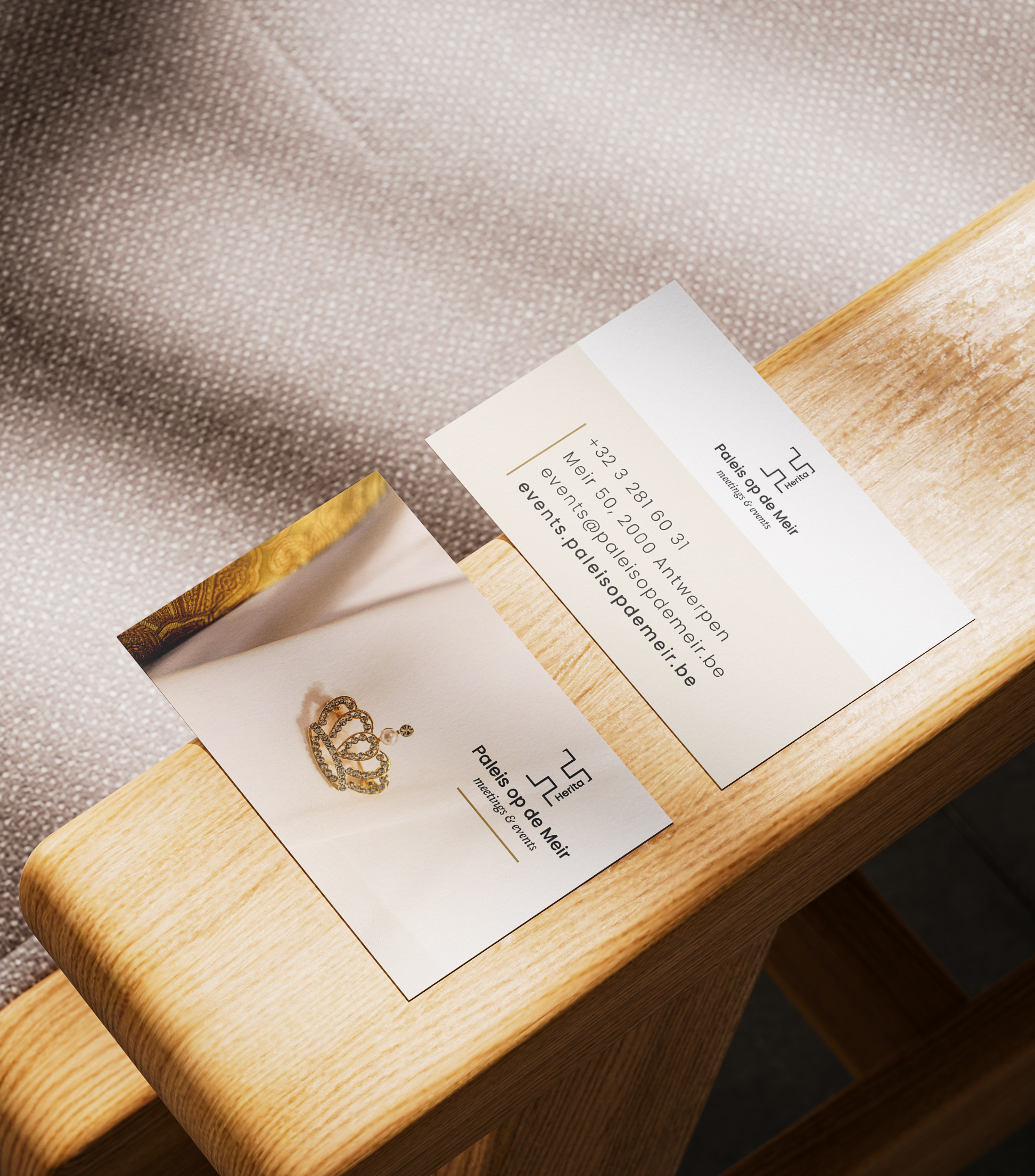 Vervolgens werd de nieuwe visuele identiteit breed toegepast in de website, postkaarten, visitekaartjes, e-mailtemplates en een foodbrochure. Elk ontwerp werd afgestemd op het karakter en de klasse van Paleis op de Meir.